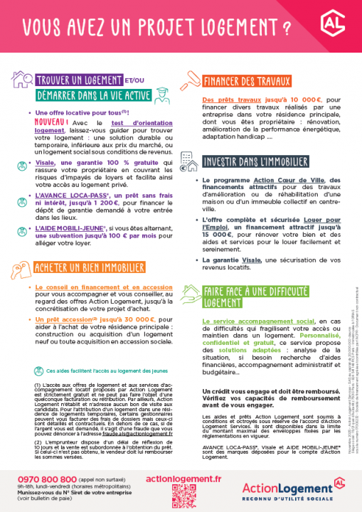 La saviez-vous: l'organisme Action Logement propose un certain nombre d'aides dans le cadre du logement (accession propriété, aides pour travaux, impayés, ...) que vous soyez CDI, CDD, alternants,... N'hésitez pas à vous renseigner et consultez les documents.